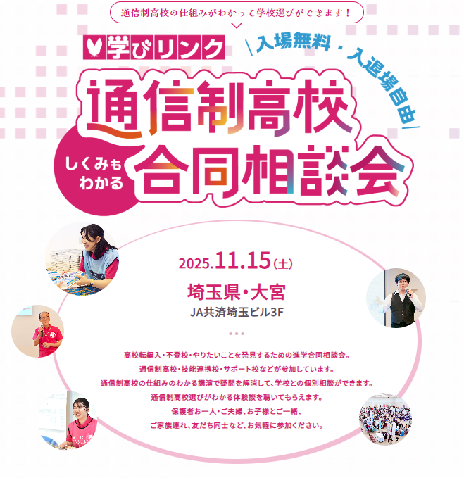 11/15(土)「通信制高校合同相談会」(大宮)に出展します 2025.11.13 11月15日(土)に大宮・JA共済埼玉ビルディングで開催される「学びリンク 通信制高校・サポート校 合同相談会」に出展いたします。 入場無料・入退場自由となっております。 中学生、高校生のみなさまのご来場をお待ちしています。 #お知らせ #入試情報 夢育トピックスへ戻る ◀ 前のトピック 次のトピック ▶ いつでもお気軽にご相談・お申し込みください