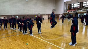 11月13日(木)にスポーツ大会を行いました。赤、緑、青、黄色、黒、白組に分かれての対抗戦です。どのチームも応援グッズを準備し、優勝を目指します。最初の競技はクラス対抗で、八の字大繩跳びです。クラス全員一致団結して戦いました。