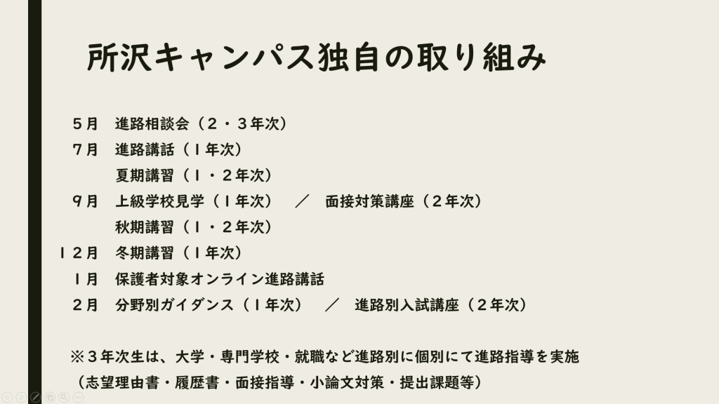 保護者対象オンライン進路講話 1月17日(土) 2026.01.17 保護者対象オンライン進路講話を開催し、多くの保護者様にご参加いただきました。 「進路選択に向けて必要なこと」と題し、上級学校の入試概要や本校での進路指導の取り組み、勉強のポイントなどを紹介しました。 #お知らせ #お知らせ #進路 #進路・検定 所沢キャンパスブログへ戻る ◀ 前のトピック 次のトピック ▶ いつでもお気軽にご相談・お申し込みください