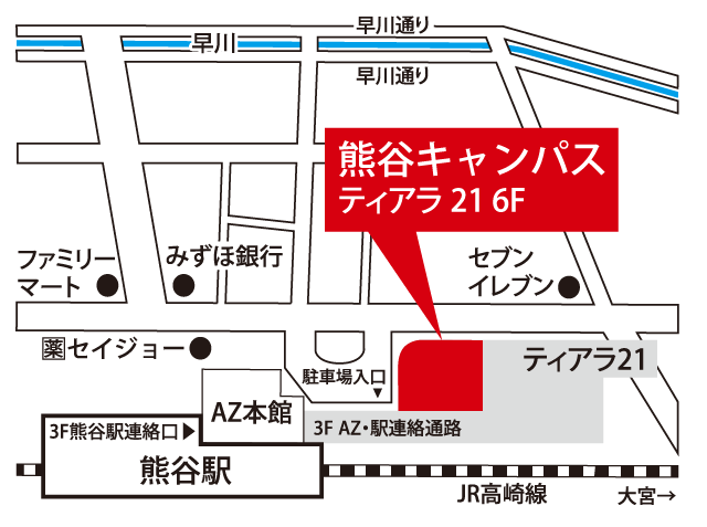 JR熊谷駅の駅ビル(ティアラ21)の6階で通いやすい立地です。JR高崎線・上越新幹線・北陸新幹線、秩父鉄道が利用でき、熊谷市内はもちろん、深谷・行田・本庄・鴻巣など周辺地域からもアクセス良好です。雨の日も濡れずに安心して通学できます。